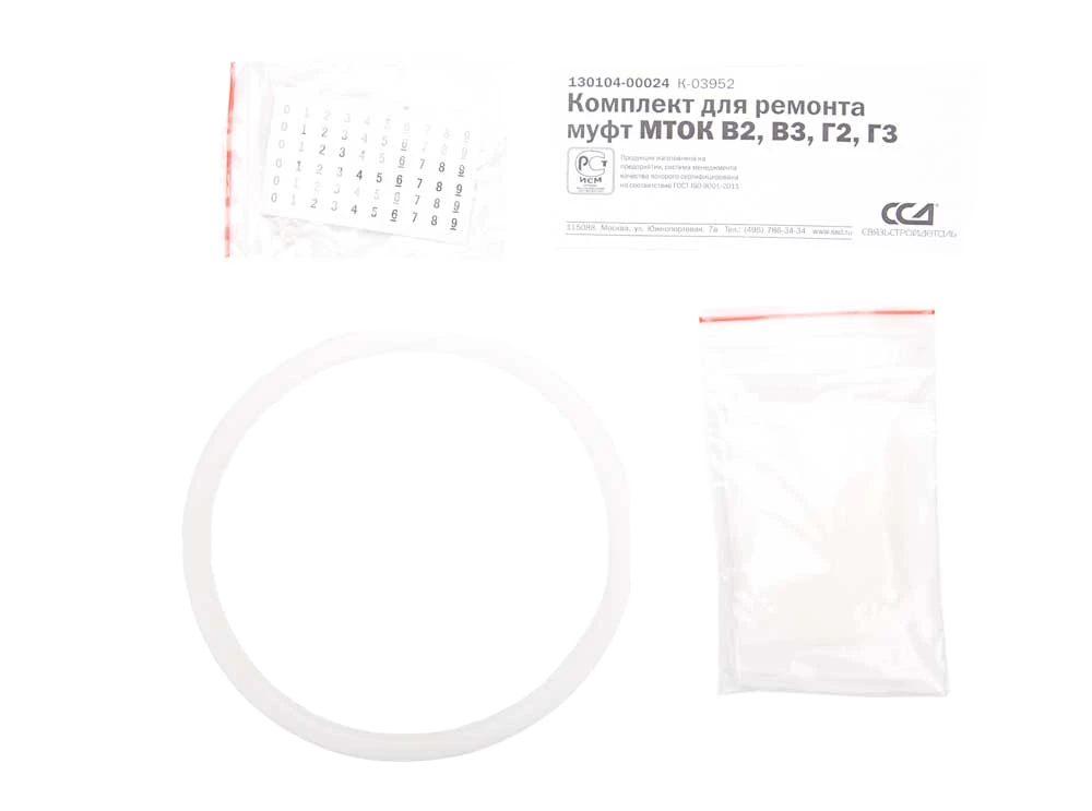 В комплект входит уплотнительное кольцо, устанавливаемое в зазор между оголовником и кожухом муфты, маркеры и стяжки, которые могут потребоваться при проведении ремонтных работ и бумажный пакет силикагеля, упакованный в дополнительный герметичный п/э пакет. Перед повторным закрытием муфты пакет с силикагелем необходимо извлечь из герметичного пакета и разместить внутри муфты.
